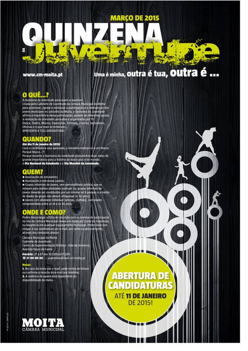 Até 11 de janeiro, estão abertas as candidaturas para apresentação de projetos a integrar o programa da Quinzena da Juventude/2015, no concelho da Moita.