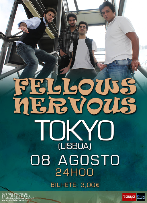Os Fellows Nervous vão passar pelo palco do Tokyo Lisboa no próximo dia 8 de agosto, para um concerto com início às 24h00. A banda de Santarém não deixa ninguém indiferente nas suas atuações ao vivo, contagiando quem passa com a sua energia inesgotável. "Enfadonho", o single mais recente, é o segundo tema retirado do EP “Escuta”, editado em fevereiro pela Music In My Soul, e sucede ao single de apresentação, "Boa".