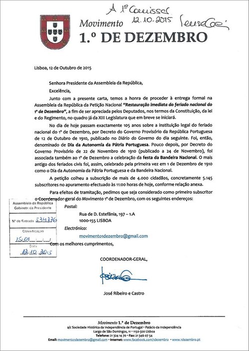 Dezenas de bandas filarmónicas em representação de todos os distritos do país vão desfilar em Lisboa, no próximo dia 29 de novembro, no âmbito das comemorações do Dia da Restauração que se assinala a 1 de Dezembro. Entretanto, o Movimento 1º de Dezembro já entregou na Assembleia da República a petição nacional para a “Restauração imediata do feriado nacional do 1º de Dezembro”.