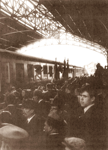 A Estação de Ovar em 1952, ainda com a cobertura da marquise envidraçada, repleta de gente, à chegada do “Comboio da Saudade”