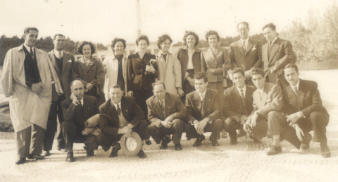Grupo Coral da Casa do Concelho de Ovar em Lisboa numa visita ao Estádio Nacional, onde se destacam alguns membros fundadores desta colectividade: Em baixo, o 1.º da esquerda é José André Redes. De pé, da esquerda para a direita: 1.º Francisco de Oliveira Faneco, e o antepenúltimo o seu pai, Artur de Oliveira Faneco.