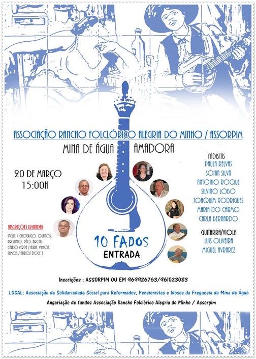 A Associação Rancho Folclórico Alegria do Minho/Assorpim leva a efeito uma sessão de fados, ater lugar no próximo dia 20 de março, pelas 15 horas, nas instalações da Associação de Solidariedade Social para Reformados, Pensionistas e Idosos da Freguesia da Mina de Água (ASSORPIM).