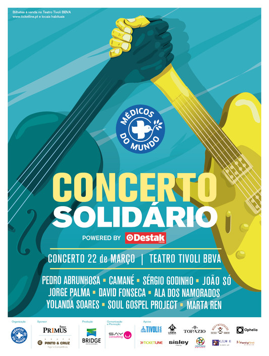 Para continuar a assegurar cuidados de saúde gratuitos e uma intervenção de proximidade junto das populações mais desfavorecidas, a Médicos do Mundo depende da solidariedade de diferentes parceiros e particulares, na angariação de fundos para a sua actividade e na operacionalização de projectos nas mais diversas áreas. Para a realização deste Concerto Solidário a Médicos do Mundo conta com o apoio da Bridge, Câmara Municipal de Lisboa, CHM Acrílicos, Family First, Miss&Moustache, Movimento Pessoas@2020, Ophelia, Say U Consulting, Sisley Paris, Teatro Tivoli BBVA, Ticketline e Topázio e com o patrocínio do Banco Primus, jornal Destak e Grupo Pinto e Cruz.