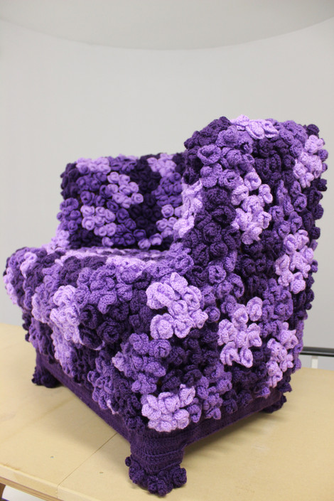- cadeirão totalmente revestido a crochet, com 1379 flores em 3 tons de roxo, 7kgs de lã, resultado de 650 horas de trabalho