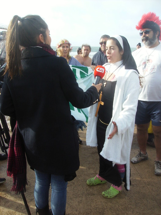 António Santos, 93 anos, é um dos pioneiros desta tradição e alcançou hoje o 75.º banho no mar no dia 1 de janeiro. São muitas as histórias que António Santos tem memorizadas destes primeiros banhos do ano, que começaram por iniciativa de um grupo de amigos em 1943. "Em 1942 lemos no jornal que dois malucos se mandaram ao Tamisa à meia-noite [de 01 de janeiro]. Em 1943 decidimos também entrar no mar no primeiro dia do ano", conta António Santos à agência Lusa. Desde 1943 até hoje têm sido muitos a juntar-se à iniciativa, uma experiência que os banhistas asseguram que traz benefícios para a saúde. Inácio Abreu cumpriu hoje o seu terceiro banho de mar no primeiro dia do ano e afirma que se sente fisicamente "muito bem" com esta tradição, que a mulher acompanha do areal e apenas para "transportar a toalha". "Não sei se é mania, mas a pessoa fica melhor. Gosto muito de nadar e não dispenso este mergulho", disse Inácio Abreu, de 71 anos, contando que o mar de Carcavelos estava hoje mais quente do que nos anos anteriores, embora mais perigoso. Cesarina Rocha também já mergulha no Ano Novo há três anos e sente igualmente os efeitos positivos na saúde: "é muito bom, nem me constipo nem nada. Sinto mesmo diferença na saúde, até nos ossos, sinto-me muito melhor". Mesmo os mais jovens sublinham as vantagens de começar o ano com um banho de mar, mesmo em dias mais frios. Hoje de manhã estava em Carcavelos um dia de sol e céu limpo, com temperaturas atmosféricas a rondar os 16 graus e com a água a cerca de 15 graus. "Assistimos na televisão há uns anos e foi algo que nos fascinou. Faça chuva, sol ou vento, vamos todos os anos, dissemos", relata Gabriela que, juntamente com o habitual grupo de amigas, optou este ano por ir ao mar vestida de Mãe Natal. Os trajes temáticos são outra tradição que estas amigas estão a juntar à do banho no mar. Depois de já terem experimentado a Capuchinho Vermelho e os fatos de banho dos anos 20, pensam que em 2019 irão vestidas de palhaças. Os disfarces não são um exclusivo deste grupo de amigas. Aliás, muitos dos banhistas que hoje de manhã se aventuraram no mar de Carcavelos optaram por trajar de modo quase carnavalesco, aliando o vestuário ao espírito de animação vivido no areal daquela praia de Cascais.